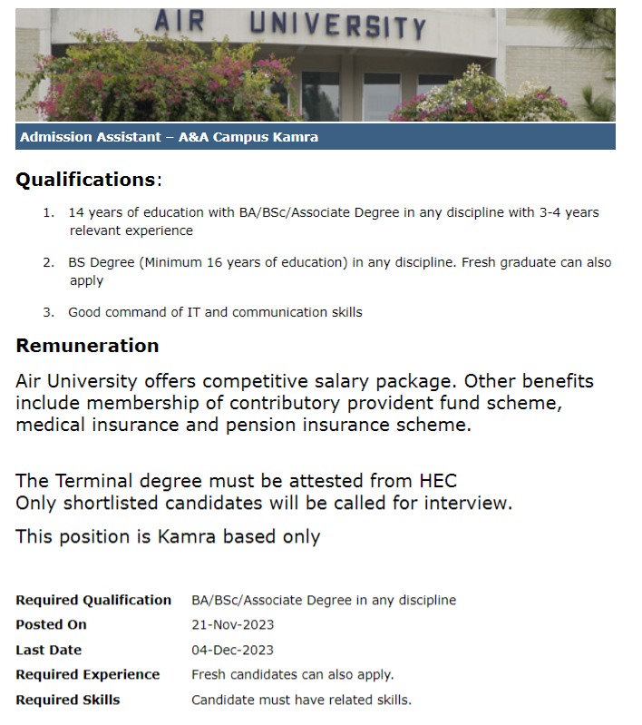 Vacant posts including admission assistant are announced in Air University Islamabad Attock, attock Punjab Pakistan as per 22 November 2023 advertisement in daily Other Newspaper. Bachelor, BA and Others etc. educational qualification will be preferred.