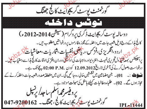 Admission in 2 Year Postgraduate Degree in Government Postgraduate College in Jhang Read newspaper ad for exact details.