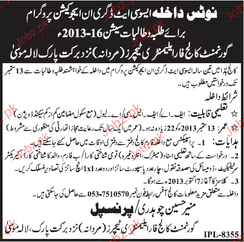 Admission in 3 Year Associate Degree in Education in Education in Government College For Elementary Teachers in Lala Musa Read newspaper ad for exact details.