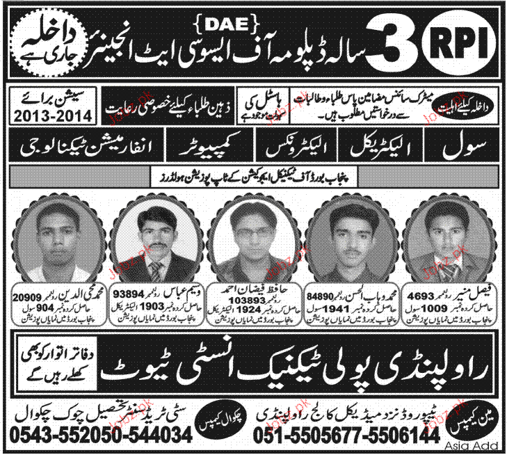 Admission in 3 Year DAE in Civil, Electrical in Rawalpindi Polytechnic Institute in Rawalpindi Read newspaper ad for exact details.