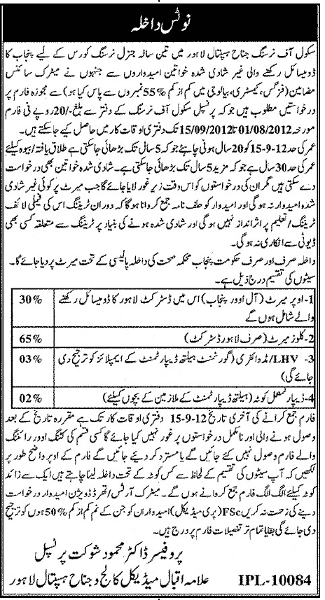 Admission in 3 Year Nursing in Allama Iqbal Medical College and Jinnah Hospital in Lahore Read newspaper ad for exact details.