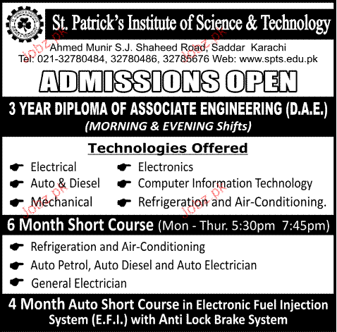 Admission in 3 Years Diploma in St Patrics Institute of Science & Technology in Karachi Read newspaper ad for exact details.