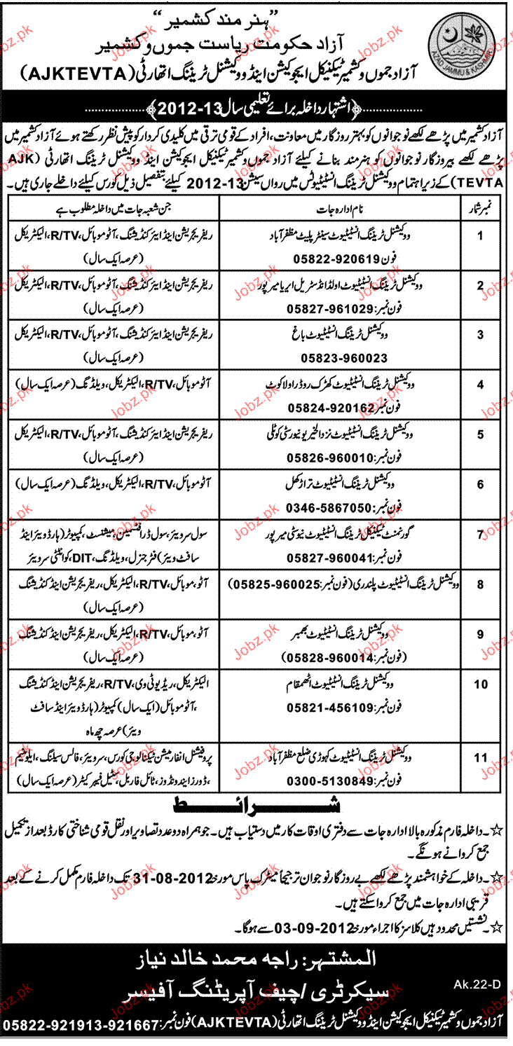 Admission in Auto Mobile, Electrical, Refrigeration, Air conditioning, Civil Surveyors, Computer Hardware, Welding adn Quantity Surveyor in Azad Jammu Kashmir Technical Education and Vocational Training Authority in Azad Jammu Kashmir Read newspaper ad for exact details.