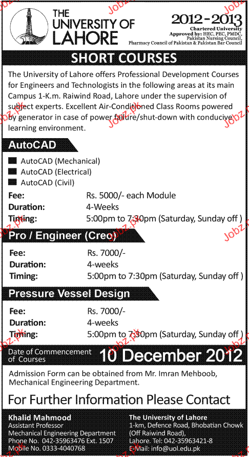 Admission in Diploma in AutoCad and Pro / Engineer in The University of Lahore Read newspaper ad for exact details.