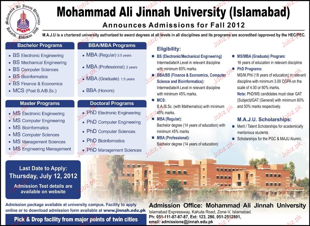 Admission in BA, BBA, MBA in Mohammad Ali Jinnah University in Islamabad Read newspaper ad for exact details.