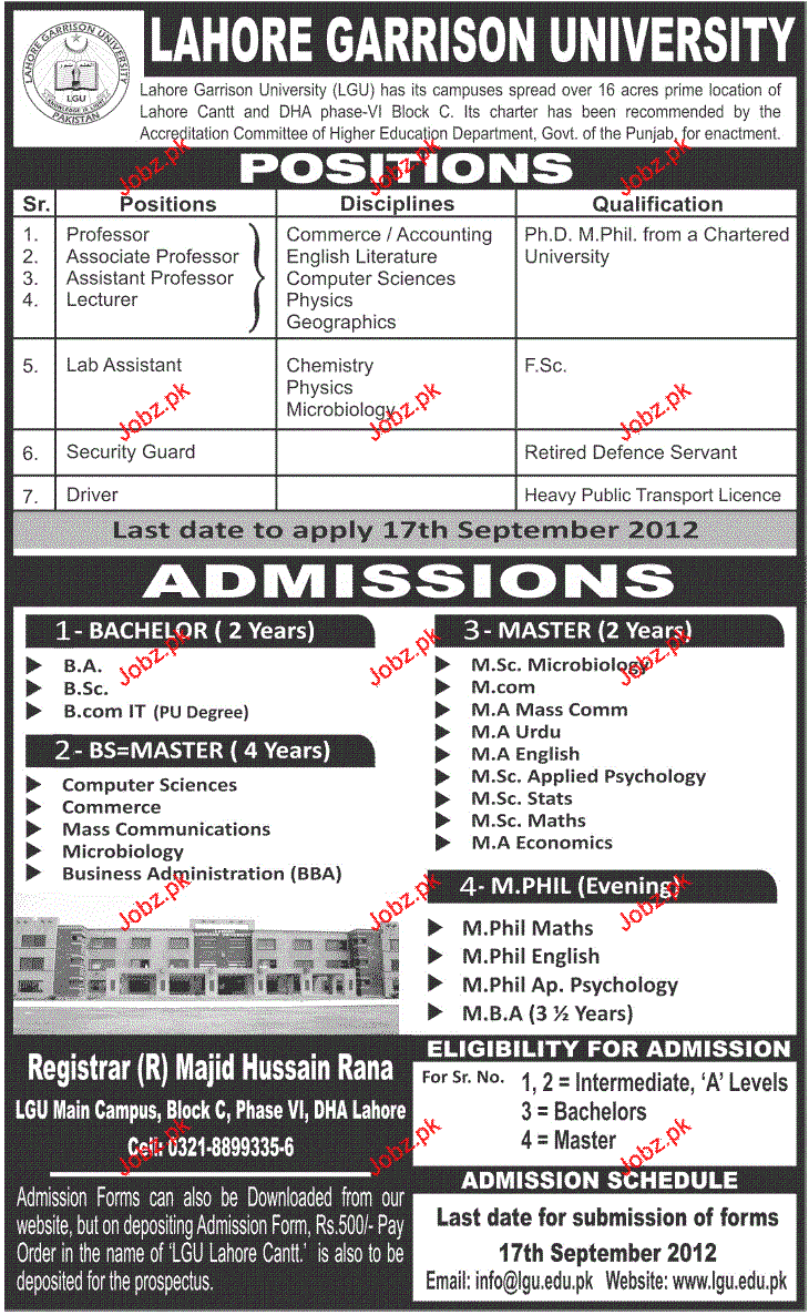 Admission in Ba, BSc, B.Com, MSc, M.Com, MA Urdu, MA English in Lahore Garrison University in Lahore Read newspaper ad for exact details.