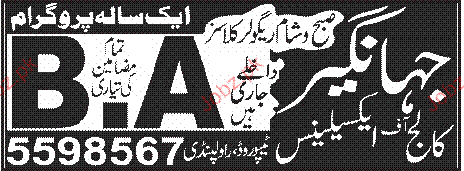 Admission in BA in Jhangir College of Excellence in Rawalpindi Read newspaper ad for exact details.