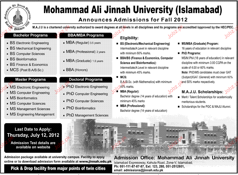 Admission in BA, MA, BBA and Phd in Mohammad Ali Jinnah University in Islamabad Read newspaper ad for exact details.
