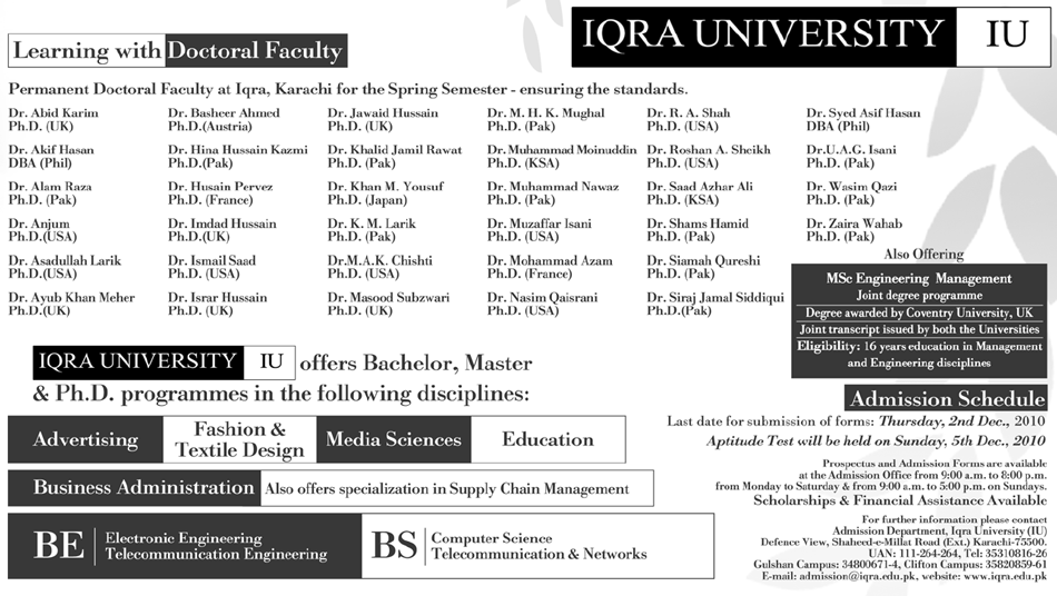 Admission in Bachelor, Master,Doctor Faculty in Iqra Univers Read newspaper ad for exact details.