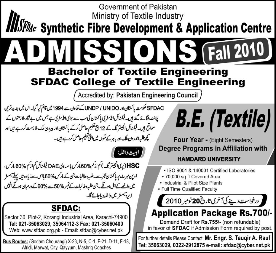 Admission in Bachelor Of Textile Engineering SFDAC Pakistan affiliated Humdard University, Karachi Read newspaper ad for exact details.