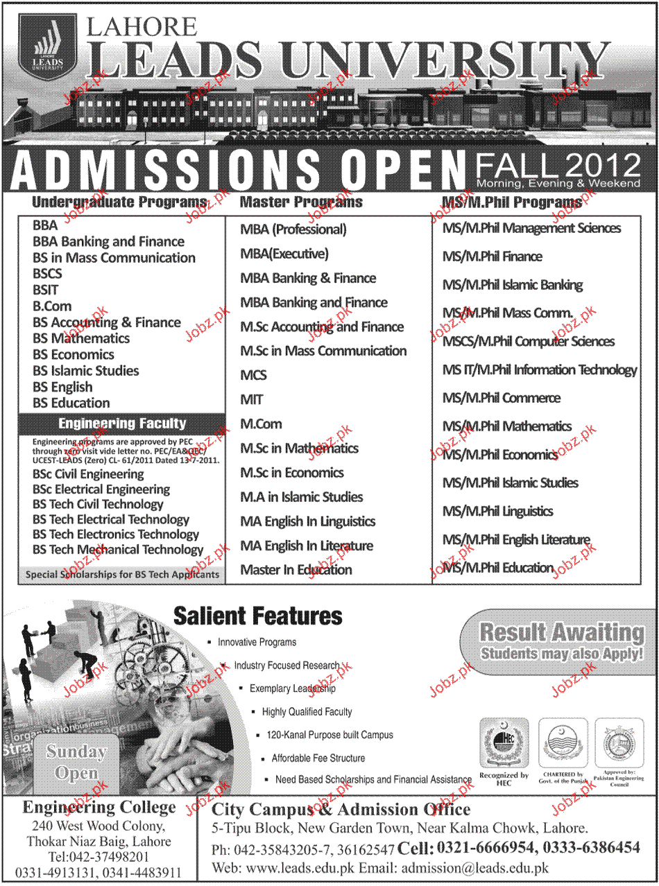 Admission in BBA, BS, MSCS, MBA Professional, Executive, banking & Finance, , MCS, MSc Accounting and Finance, MIT, MCom, MA Islamic Studies and Bsc in Lahore Leads University in Lahore Read newspaper ad for exact details.