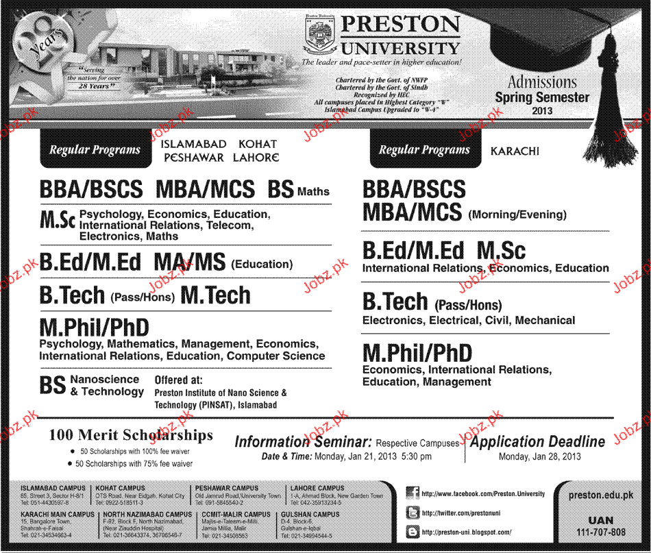 Admission in BBA, B.Ed, BS, Mphil, BBA and Msc in Preston University in Lahore Read newspaper ad for exact details.