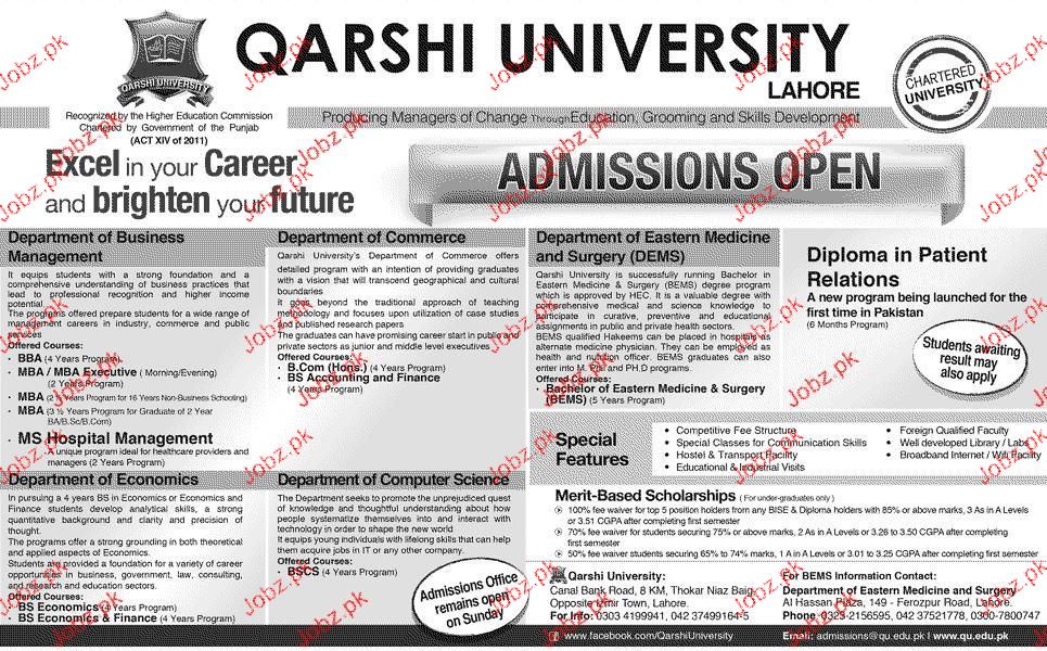 Admission in BBA, MBA and MS in Qarshi University in Lahore Read newspaper ad for exact details.