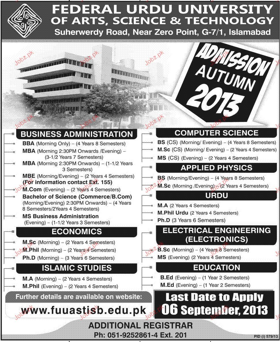 Admission in BBA, MBA, BS, MSc, Mphill and Phd in Federal Urdu University of Arts, Sciences and Technology in Islamabad Read newspaper ad for exact details.