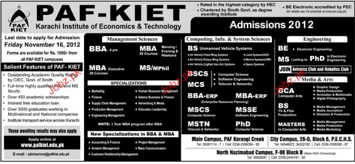 Admission in BBA, MBA, BS, BSCS, MCS, MSCS, MSTN, MSSE, Phd, BE and MS in PAF Karachi Institute of Economics and Technology in Karachi Read newspaper ad for exact details.