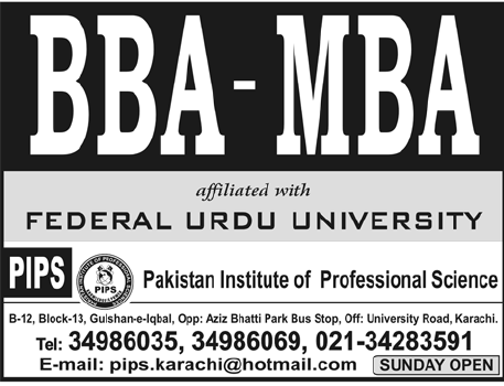 Admission in BBA, MBA in PIPS Institute Of Science, Karachi Read newspaper ad for exact details.