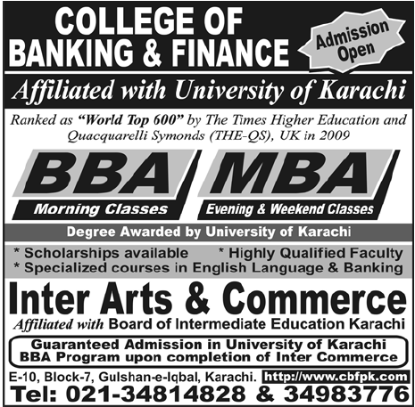 Admission in BBA, MBA in College Of Banking & institute, Karachi Read newspaper ad for exact details.