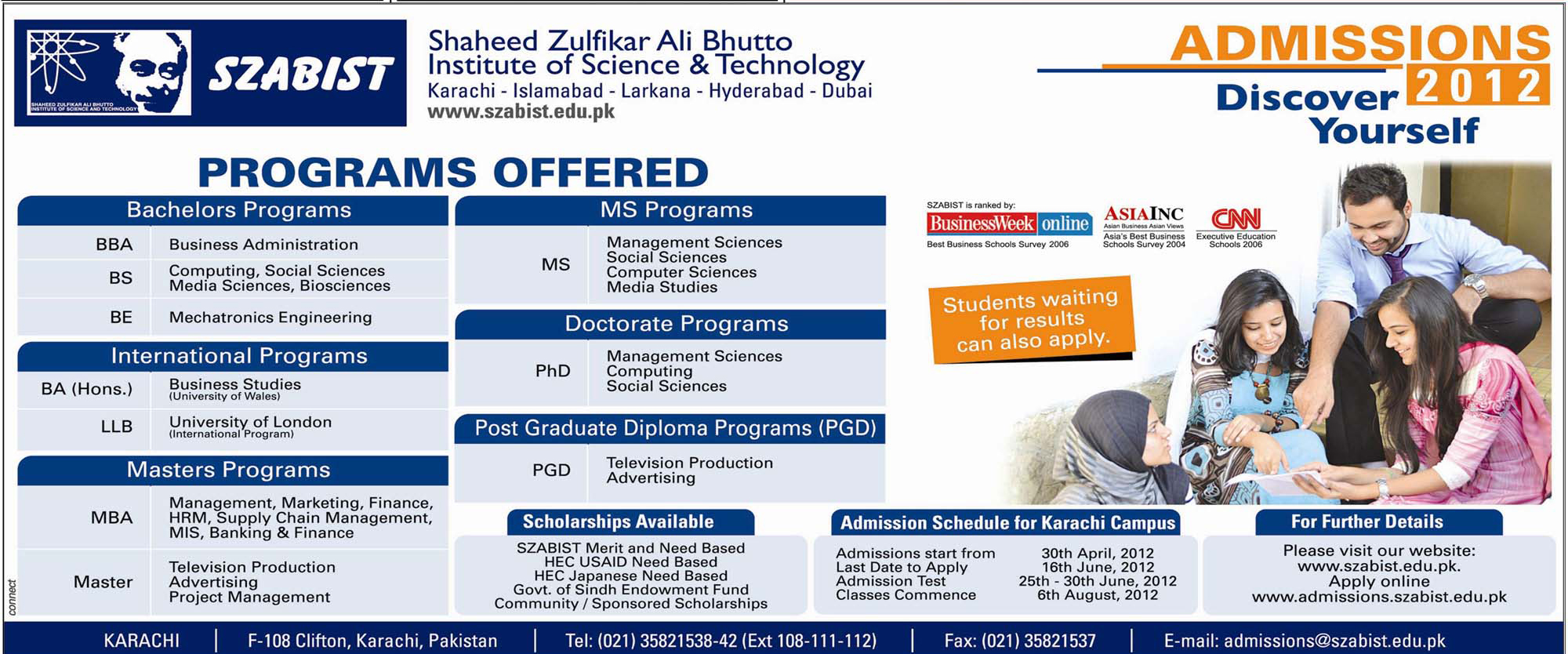 Admission in BBA, LLB, MBA, MA. MS and PGD in Shaheed Zulifkar Ali Bhutto Institute of Science and Technology in Karachi Read newspaper ad for exact details.