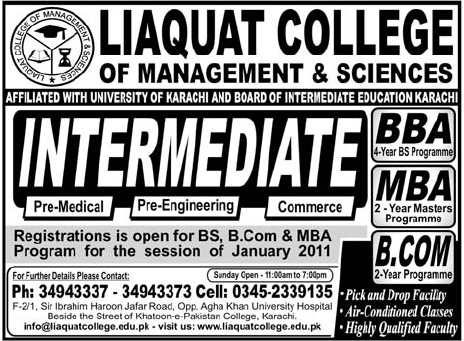 Admission in BBA,MBA.B.Com in liquat Medical College,Karachi Read newspaper ad for exact details.