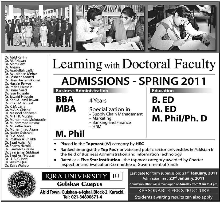 Admission in BBA,MBA,MPhil,B.ED.M.ED. in IQRA University Karachi Read newspaper ad for exact details.