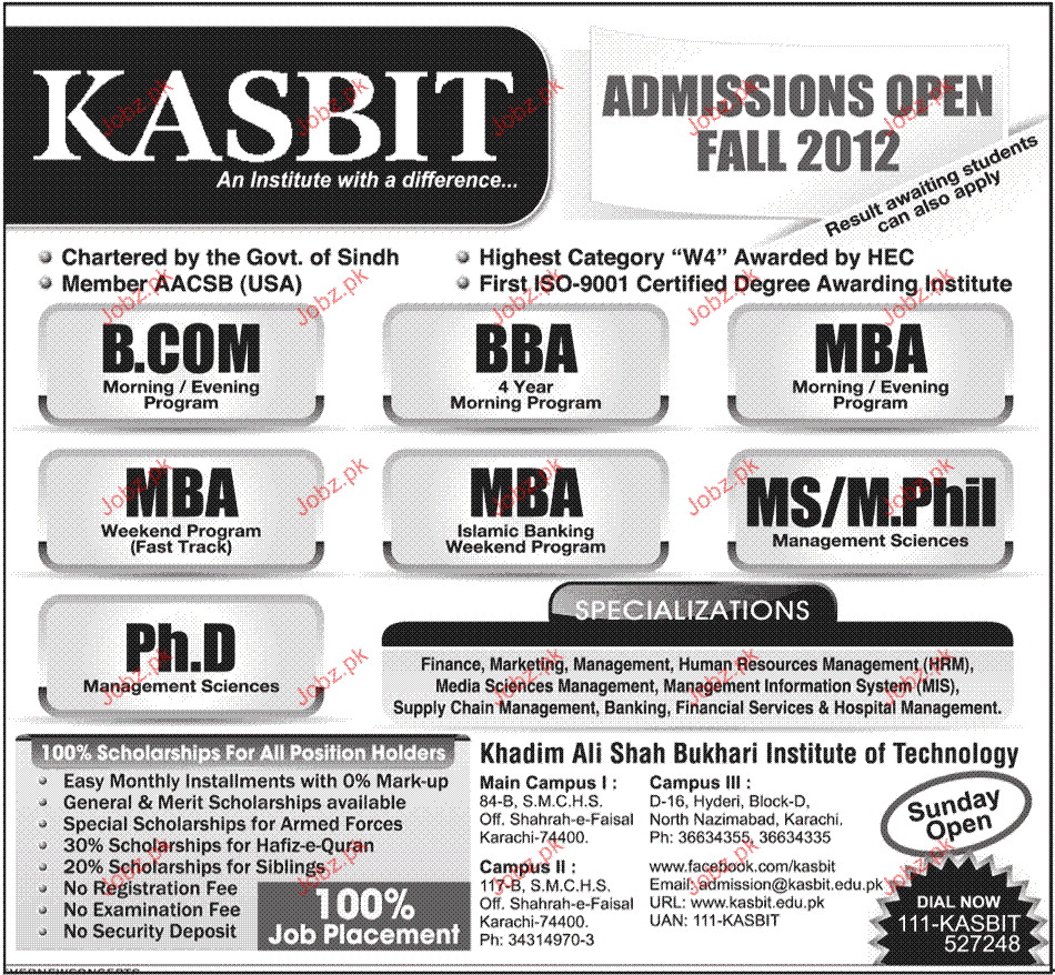 Admission in B.Com, BBA, MBA Islamic Banking, Phd and Mphill in Management Sciences in Khadim Ali Shah Institute in Karachi Read newspaper ad for exact details.