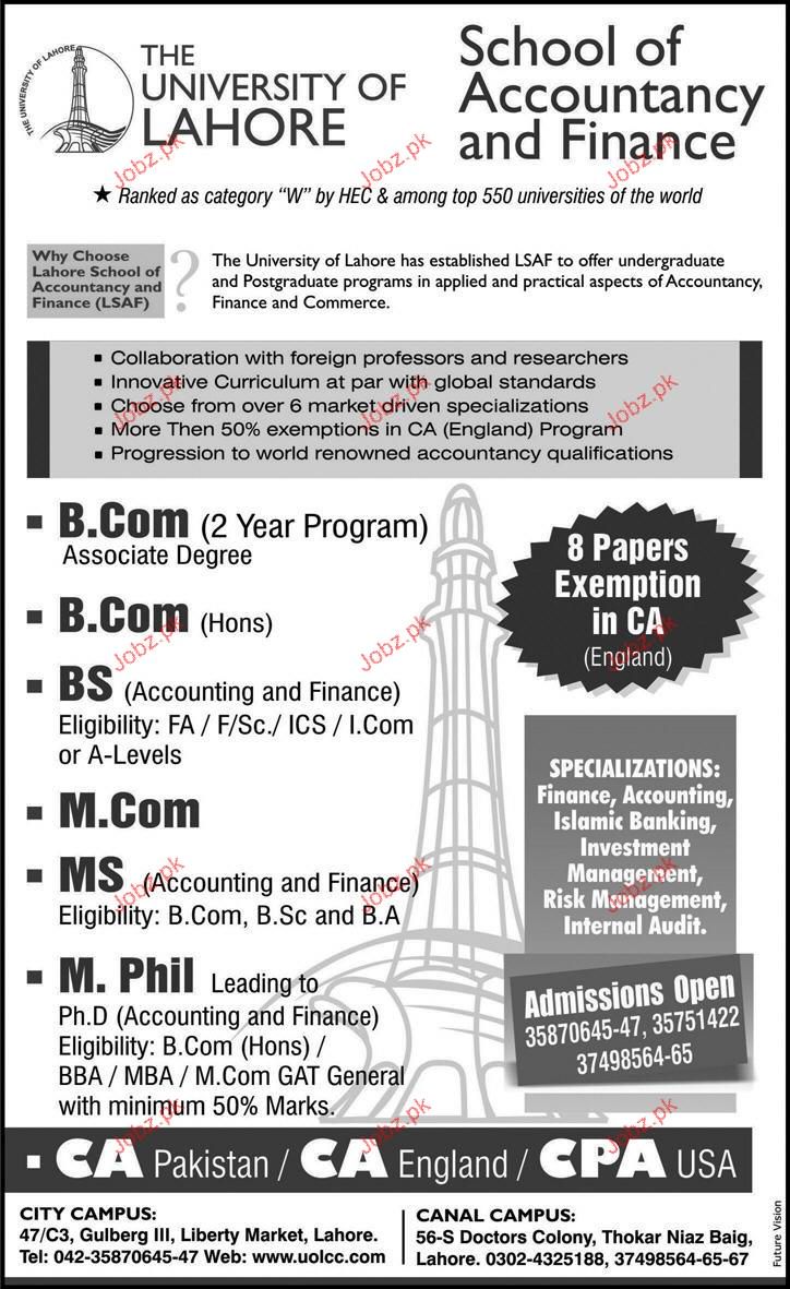 Admission in B.com, BS, MS and M.Phill in The University of Lahore Read newspaper ad for exact details.