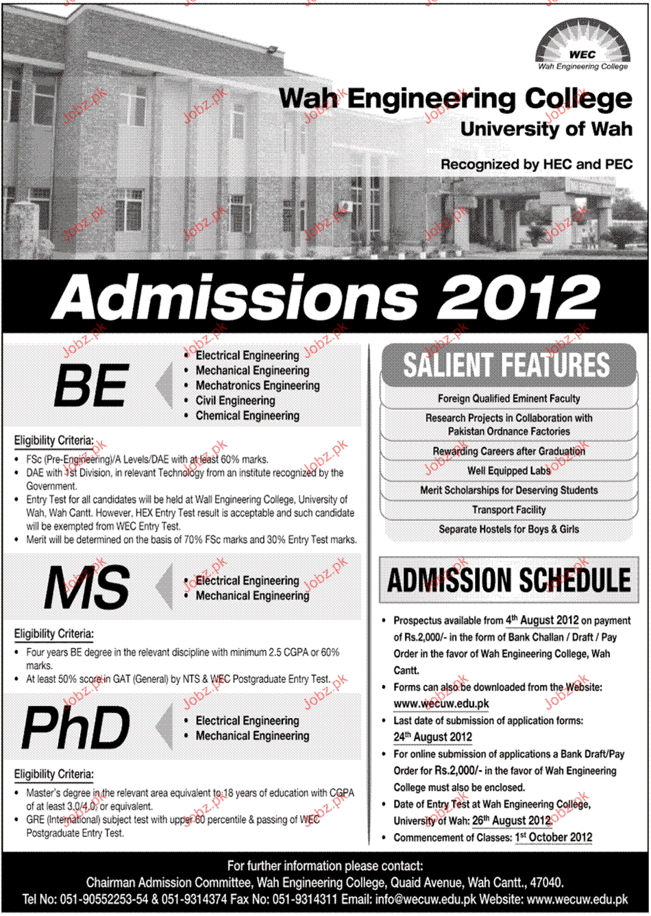 Admission in BE, Electrical Engineering, Mechanical Engineering,Civil Engineering, Chemical Engineering, MS Electrical Engineering, Mechanical Engineering & Phd in Wah Engineering College University of Wah in Wah Cant Read newspaper ad for exact details.