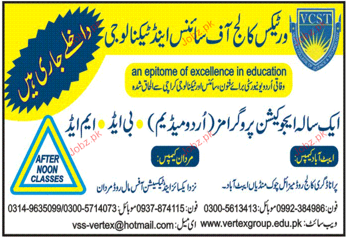 Admission in B.Ed and M.Ed in Vertix Colege of Science and Technology in Mardan Read newspaper ad for exact details.