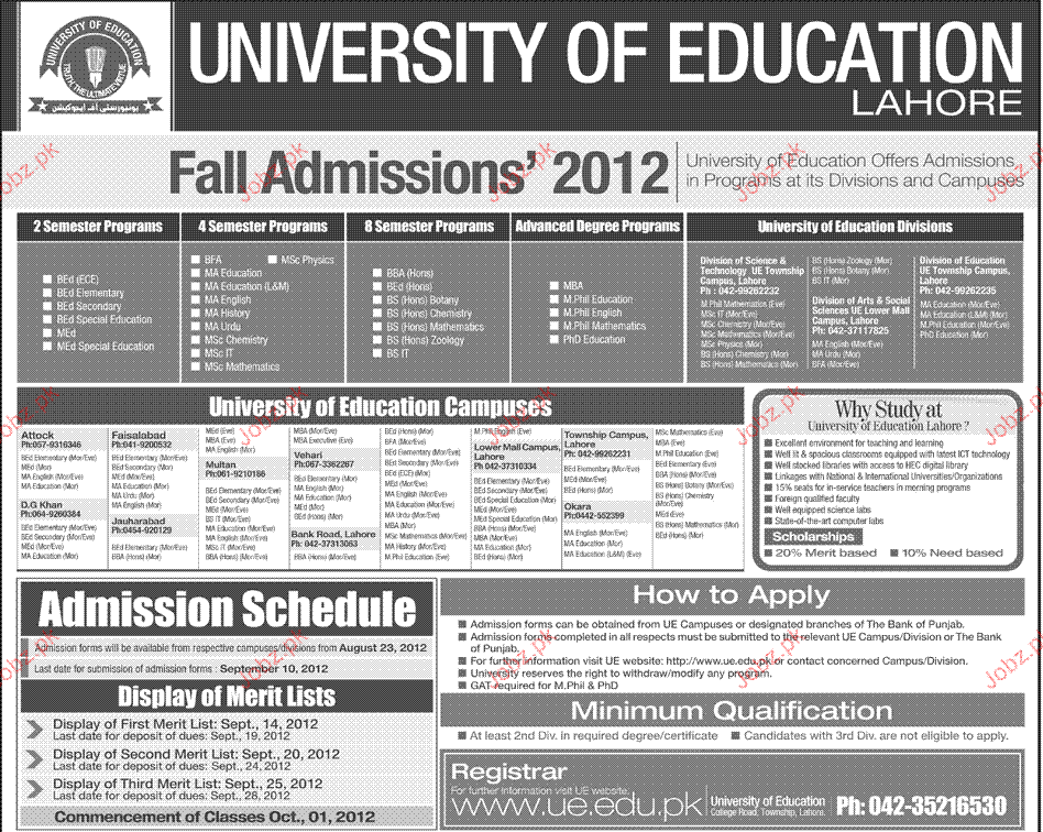 Admission in BEd, BFA, M A, BBA, BBA, BS, MSC, MS IT, MBA, Mphill Education, English and Phd in Education in University of Education in Lahore Read newspaper ad for exact details.