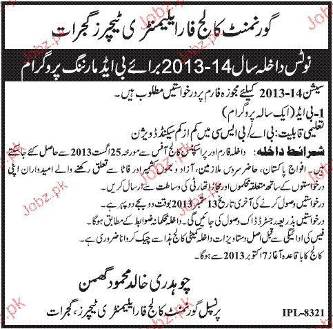 Admission in B.Ed in Government College For Elementary Teachers in Gujrat Read newspaper ad for exact details.