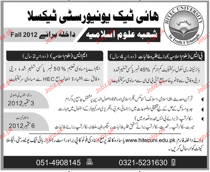 Admission in BS and MS in Hitech University Taxila