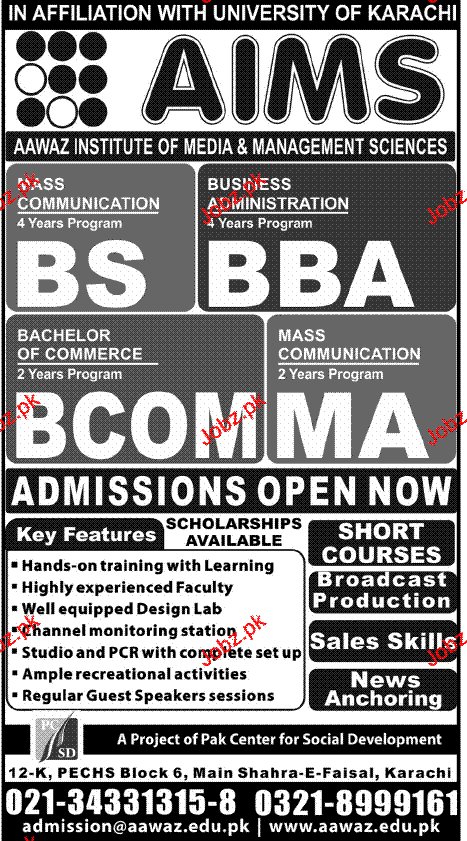 Admission in BS, BBA, B.Com and MA in Aawaz Institute of Media Management Sciences in Karachi Read newspaper ad for exact details.