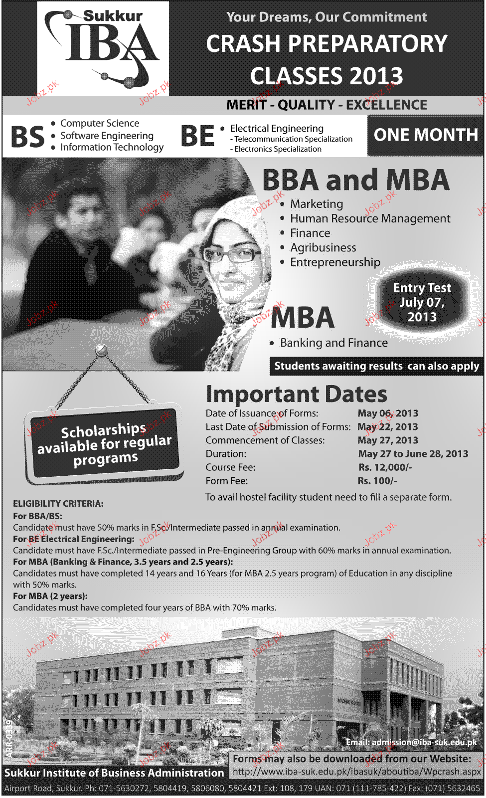 Admission in BS, BE, BBA and MBA in Institute of Business Administration in Sukkur Read newspaper ad for exact details.