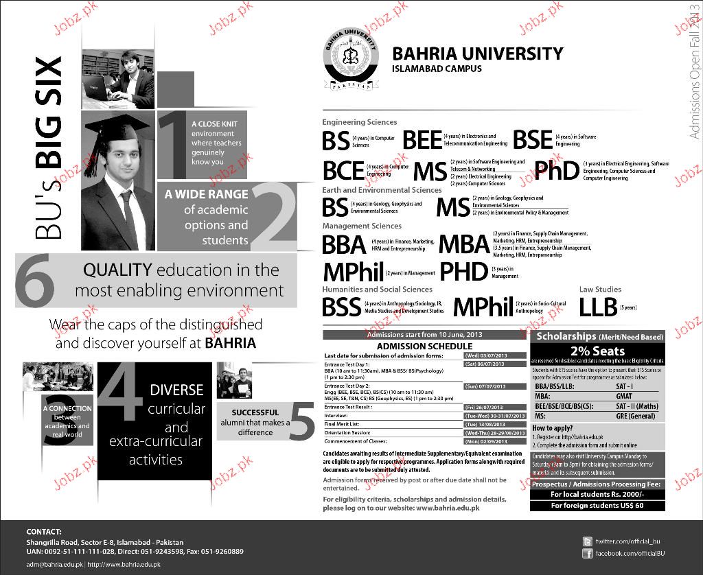 Admission in BS, BEE, BS, MBA, BSS, LLB and MBA in Bahria University in Islamabad Read newspaper ad for exact details.
