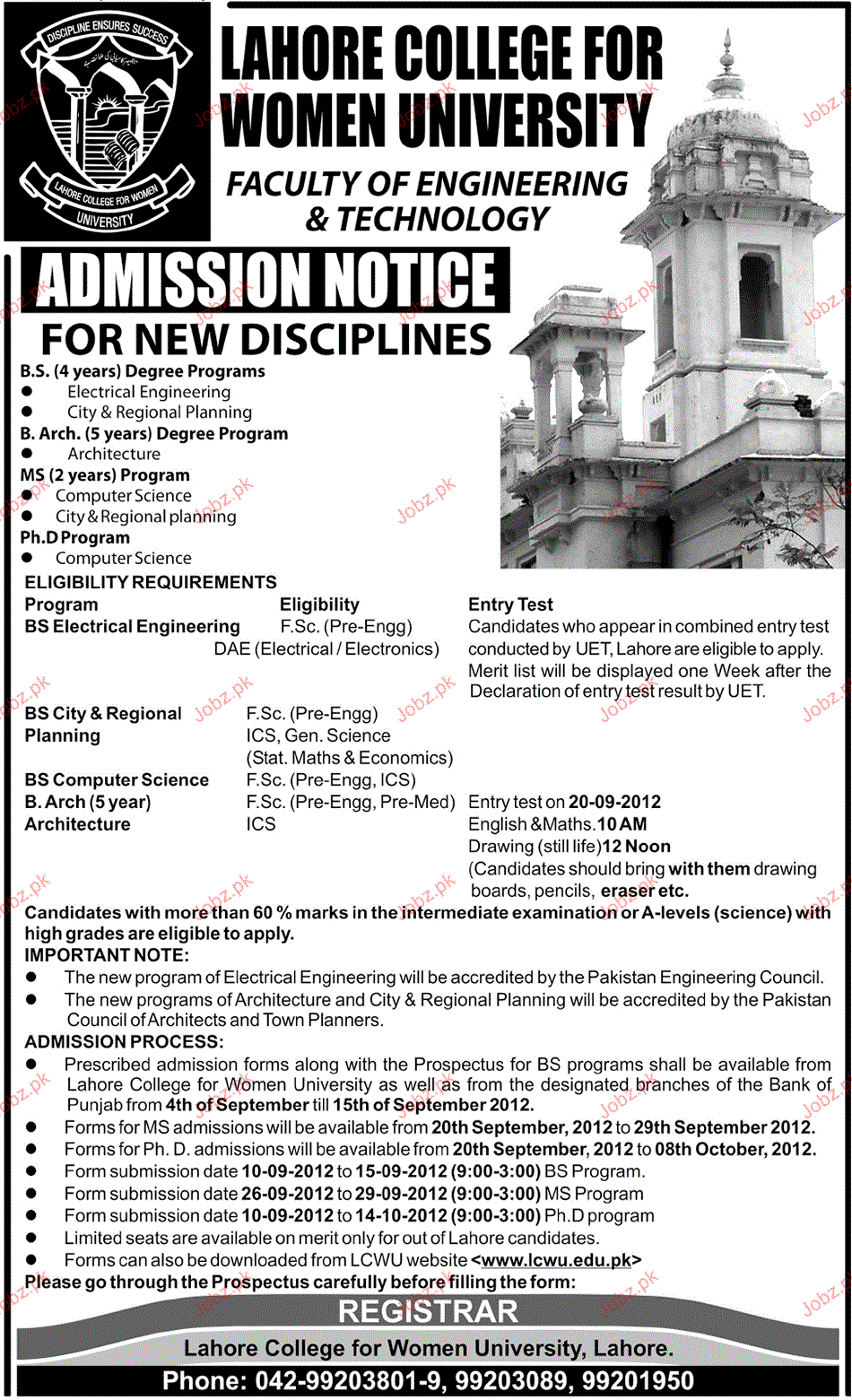 Admission in BS Electrical Engineering, MS Computer Sciences, Phd, Ms, BS Computer Science, F,Sc Pre Engineering and ICS in Lahore College For Women University in Lahore Read newspaper ad for exact details.