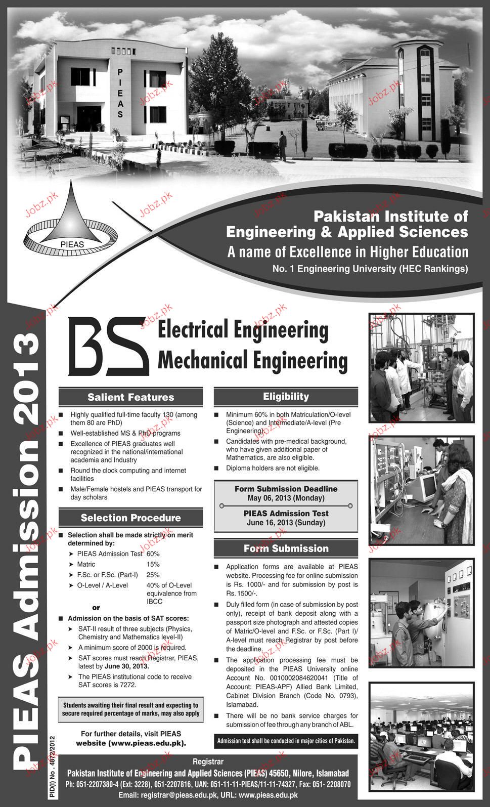 Admission in BS Electrical Engineering in Pakistan Institute of Engineering & Applied Sciences in Islamabad Read newspaper ad for exact details.