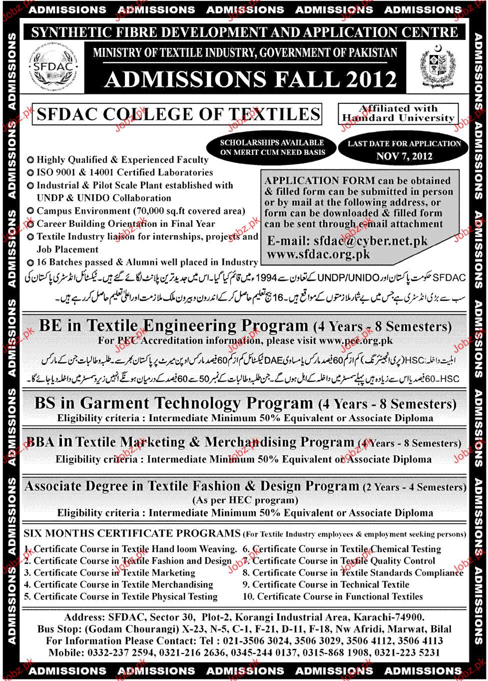 Admission in BS Garment, BS in Textile, BBA and Associate Degree in Textile and Design in Synthetic Fiber Development and Application Center in Karachi Read newspaper ad for exact details.