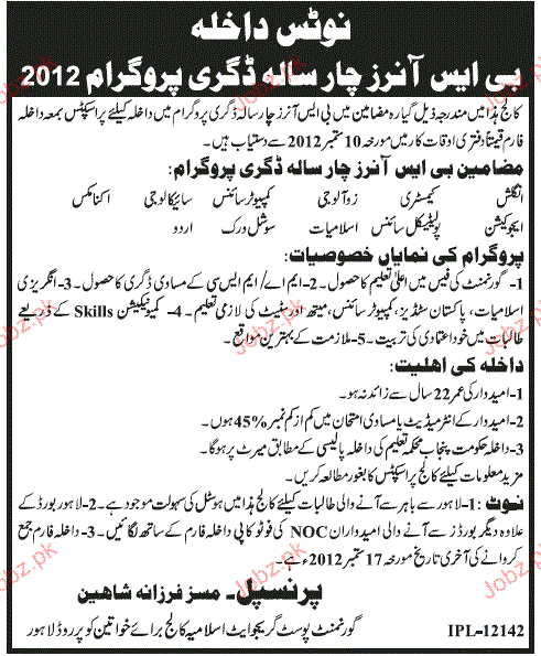 Admission in BS Honours in English, Chemistry, Zoology, Psychology, Urdu and Social Work Government Postgraduate Islamia College For Women in Lahore Read newspaper ad for exact details.