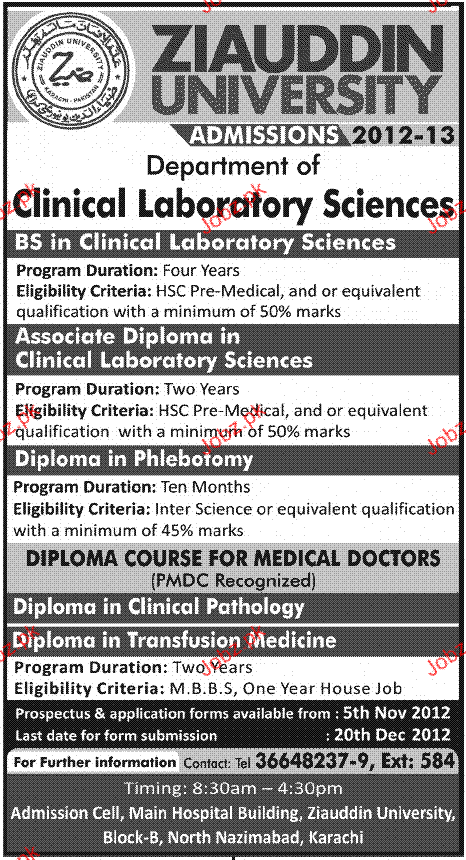 Admission in Bs in Clinical Lab Sci, Associate Diploma in Lab Science and Diploma in Phelebotimy in Ziauddin University in Karachi Read newspaper ad for exact details.