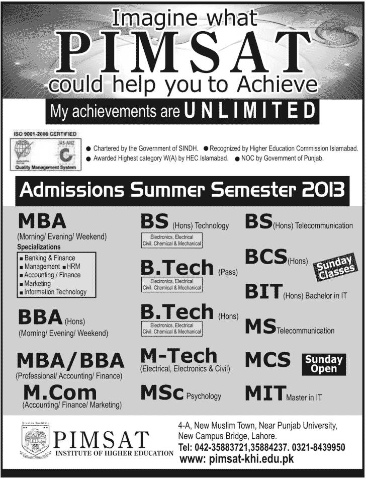 Admission in BS, MBA, BCS, BIT, MCS, MIT, Msc and M.Com in PIMSAT Institute of Higher Education in Lahore Read newspaper ad for exact details.
