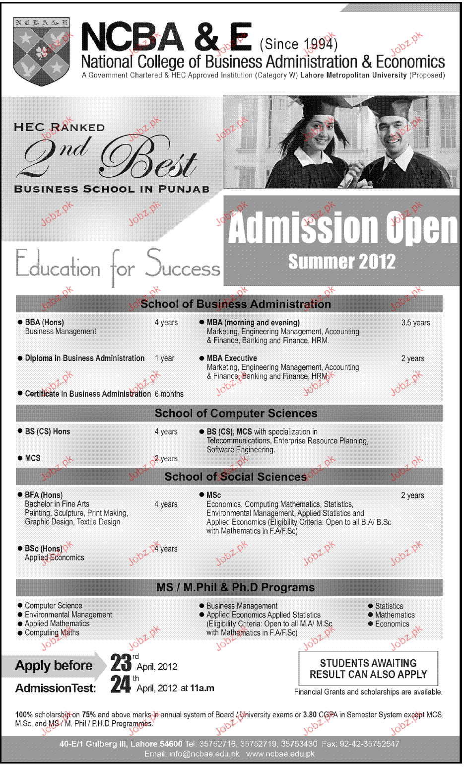 Admission in BS, MBA, BFA and BSc in National College of Business Administration in Lahore Read newspaper ad for exact details.