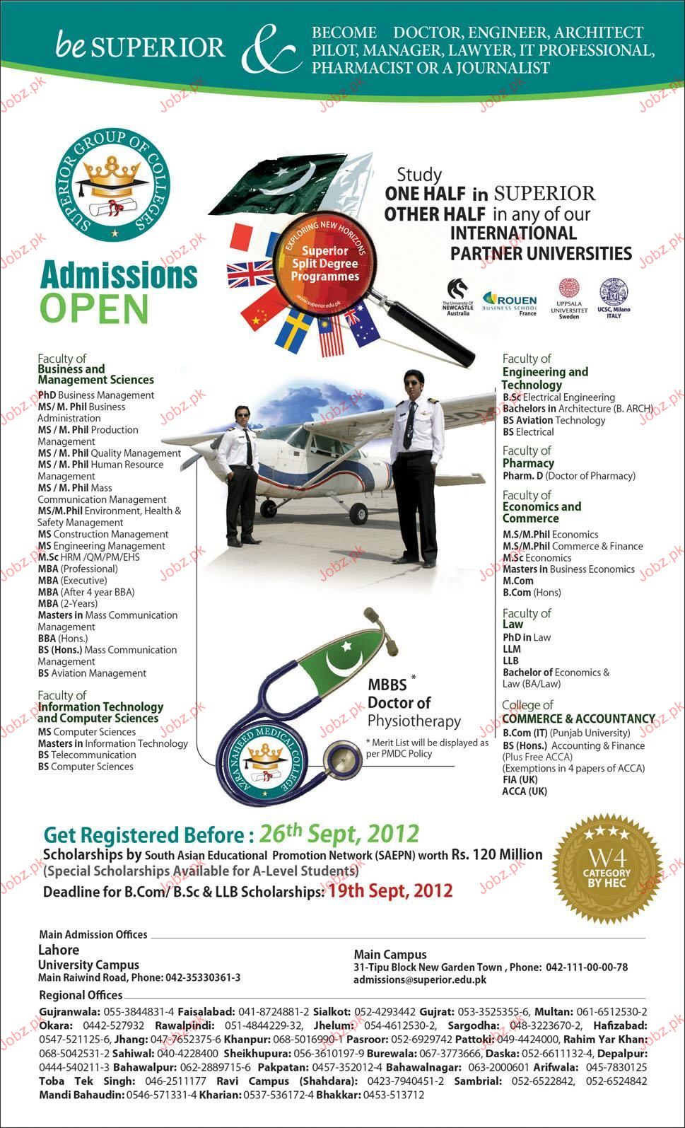 Admission in BS, Phd, Mphill, MBA, MS, Msc, BBA, BBA Hons, BS Computer Sciences in Superior Group of Colleges in Faisalabad Read newspaper ad for exact details.