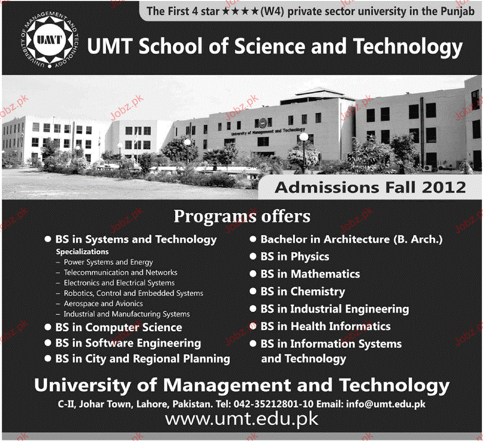 Admission in BS Systems & Technology, Phys, Chemistry, Maths and Health Information in UMT School of Sciences and Technology in Lahore Read newspaper ad for exact details.