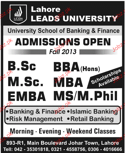 Admission in BSc, BBA, MSc, MBA, MEBA and Mphill in Lahore Leads University in Lahore Read newspaper ad for exact details.