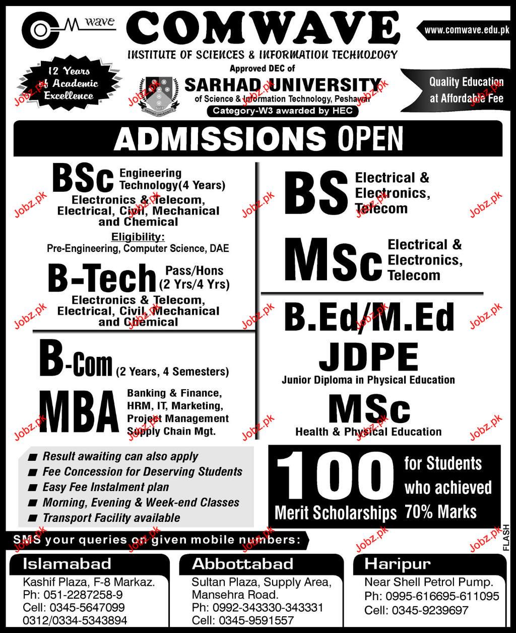 Admission in BSC, BS, MSc, B.Tech, B.Ed, M.Ed, MSc. JDPE and MBA in Comwave Institute of Sciences and Information Technology in Islamabad Read newspaper ad for exact details.
