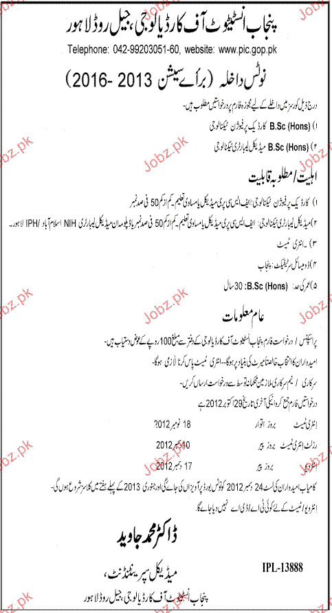 Admission in Bsc Cardica and BSc in Medical Laboratory Technicians in Punjab Institute of Cardiology in Lahore Read newspaper ad for exact details.