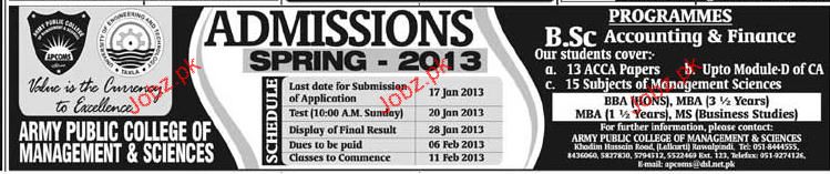 Admission in Bsc in Army Public College of Management & Sciences in Rawalpindi Read newspaper ad for exact details.