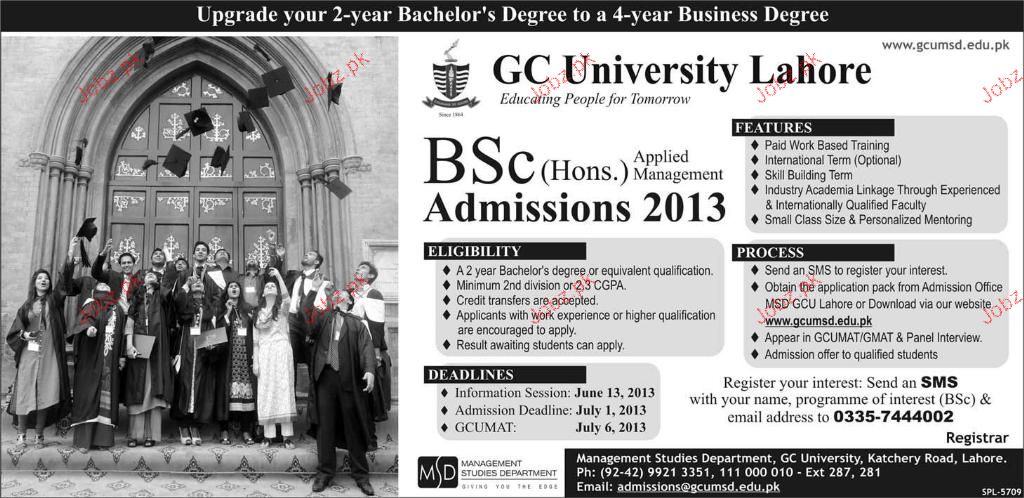 Admission in B.Sc in GC University Lahore in Lahore Read newspaper ad for exact details.
