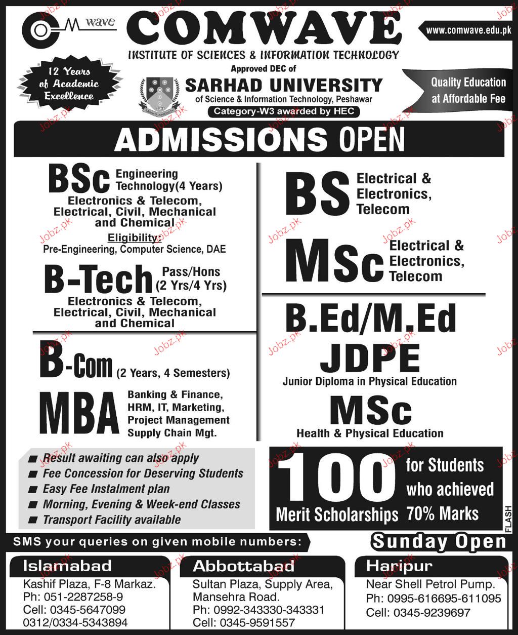 Admission in BSc, BS, MBA, MSc, JDPE, M.Ed, B.Ed and Msc in Comwave Institute of Science in Islamabad Read newspaper ad for exact details.