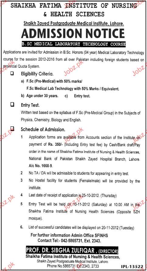 Admission in B.Sc Medical Laboratory Technology Courses in Shaikha Fatima Institute of Nursing & Health Sciences in Lahore Read newspaper ad for exact details.